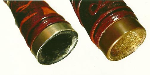 As a rule Charlie finished off the end of his crow calls with a brass or German Silver reinforcing band. On his fancy crow calls he painted the inside of the barrel gold if the band was brass or black if it was German Silver. |
