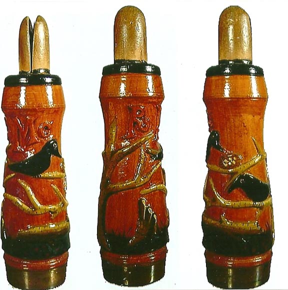 During the Great Depression ( circa 1930's)Charlie put an little extra effort into carving the stoppers on his Fancy duck calls which collectors have nickname 'Crown' stoppers. There are only six known Crown Calls in collections.The stopper on the right is his typical stopper design. The other two are examples of his Crown stoppers. |