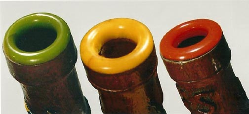 All of Charlie's finished the end of his fancy carved duck calls with a colored bakelite ring. This ring was inset into the barrel and glue in place before the red cedar barrel blank was shaped on a wood lathe. Charlie used three bakelite colors |